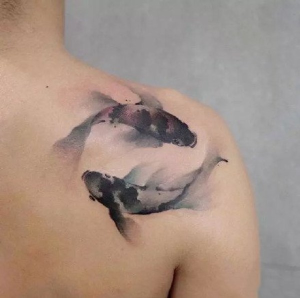 纹在后肩处的一组漂亮水墨风格纹身图片