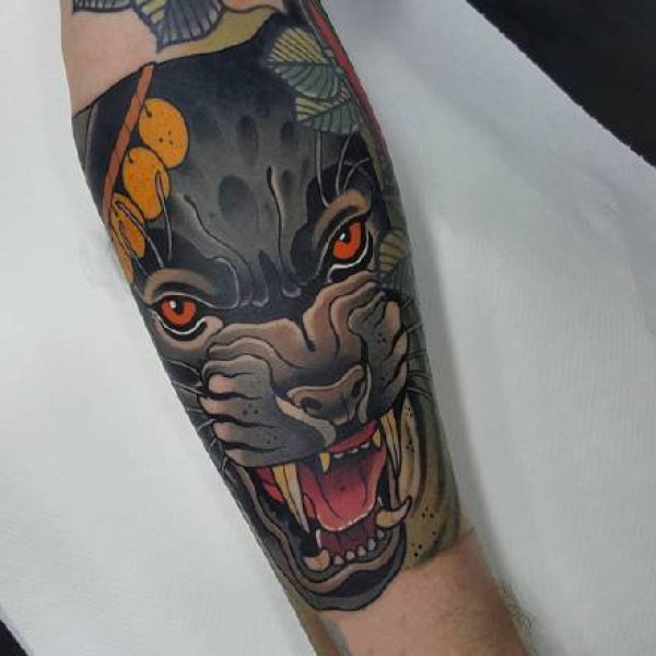 黑灰色oldschool风格豹子头纹身图案