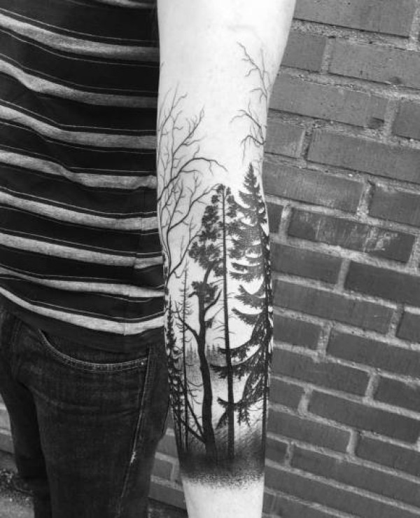 森林树木纹身图案_一组手臂上黑灰树木森林纹身图案作品