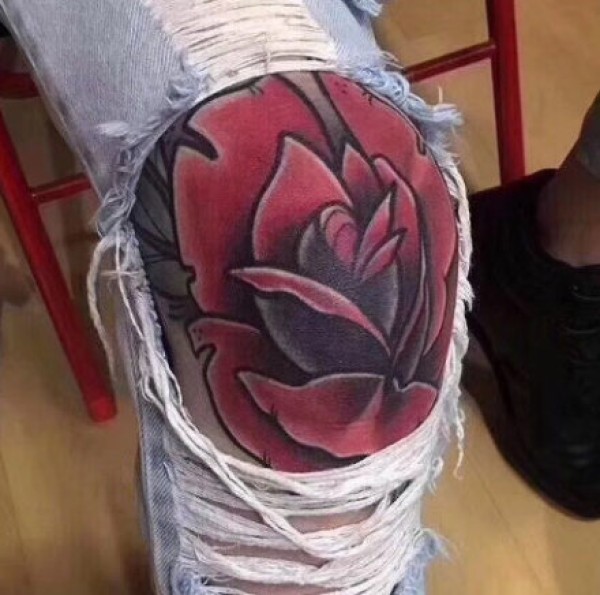 膝盖上的黑色点刺梵花图腾纹身作品图案