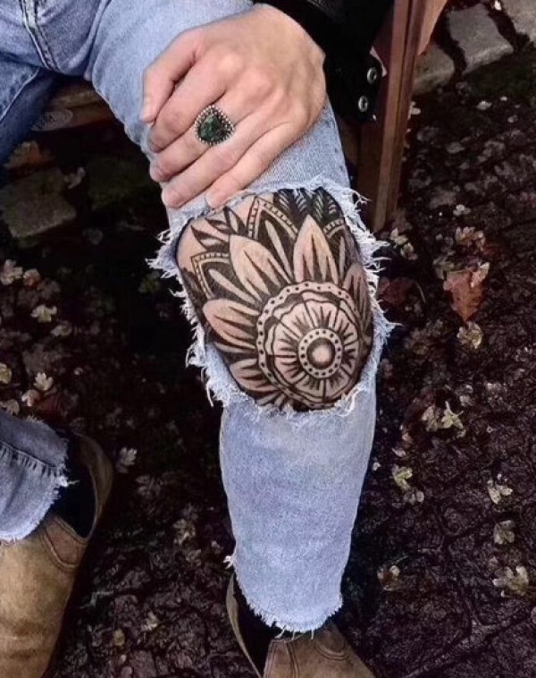 膝盖上的黑色点刺梵花图腾纹身作品图案