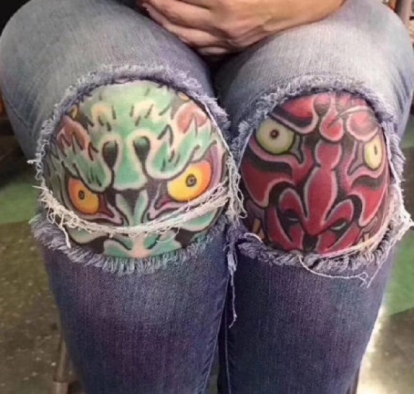 膝盖上的黑色点刺梵花图腾纹身作品图案