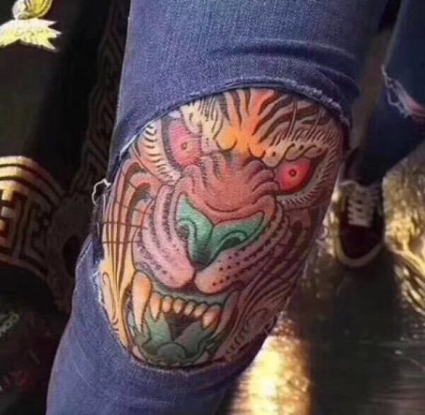 膝盖上的黑色点刺梵花图腾纹身作品图案
