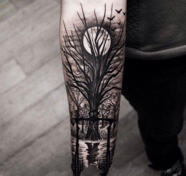 森林树木纹身图案_一组手臂上黑灰树木森林纹身图案作品