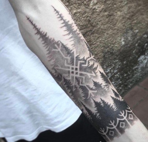 森林树木纹身图案_一组手臂上黑灰树木森林纹身图案作品