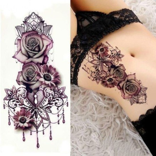 女性下腹部玫瑰花和大狼纹身图片