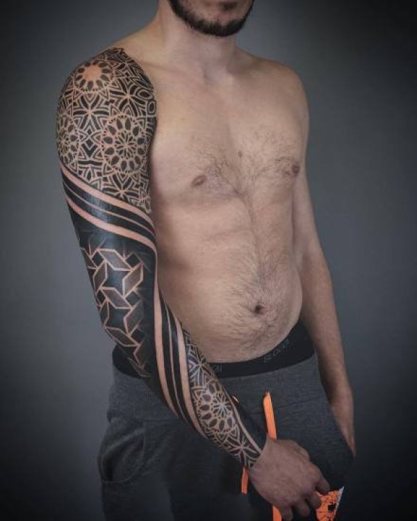 男士帅气的黑色点刺图腾花臂纹身作品