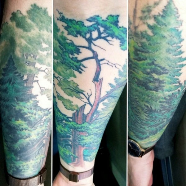 森林树木纹身图案_一组手臂上黑灰树木森林纹身图案作品