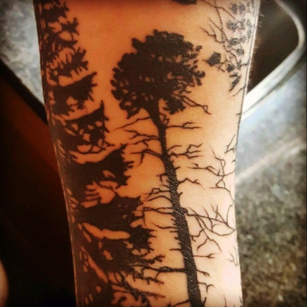森林树木纹身图案_一组手臂上黑灰树木森林纹身图案作品