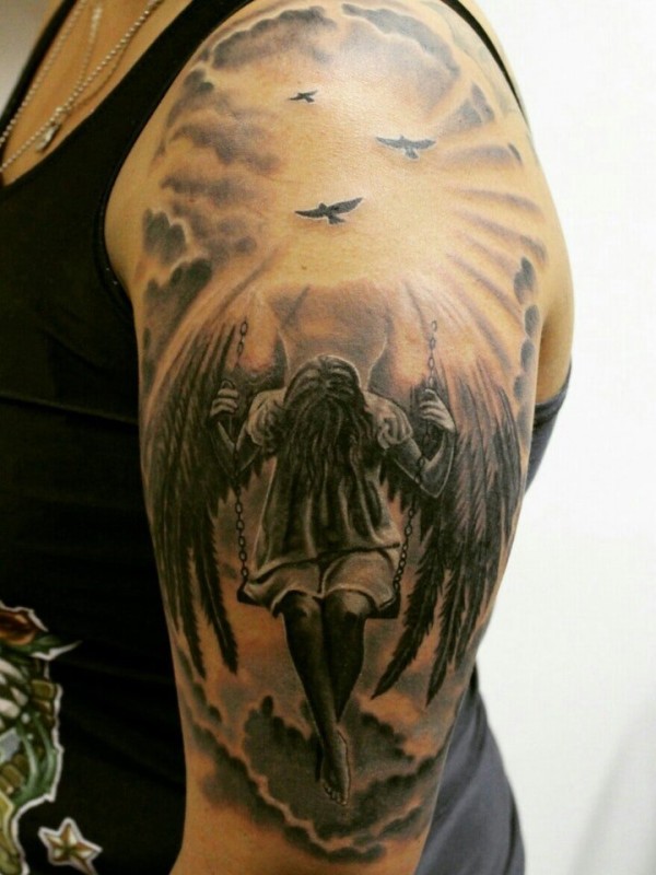 腿部黑灰天使纹身图案_天使纹身图案大全_纹身图吧