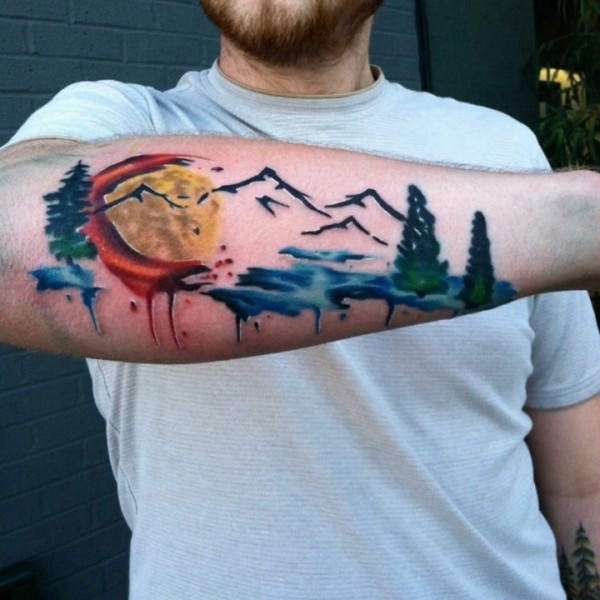 小臂彩色风景山脉几何纹身图案