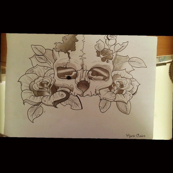 黑灰色玫瑰花和骷髅头纹身图片手稿