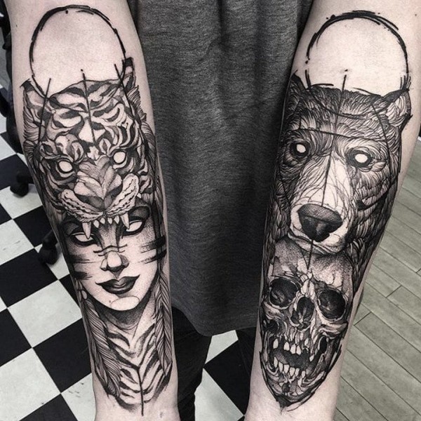 羽毛箭狐狸和熊的纹身