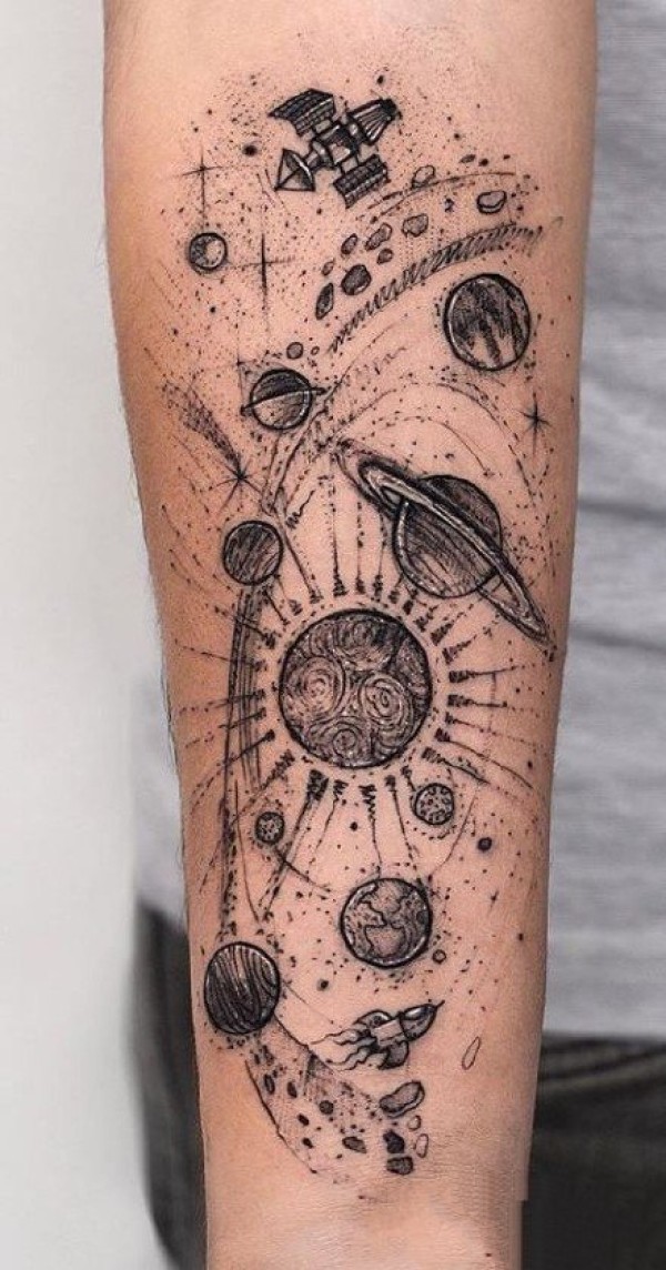 9张纯黑色胳膊上的个性星球主题的纹身图片