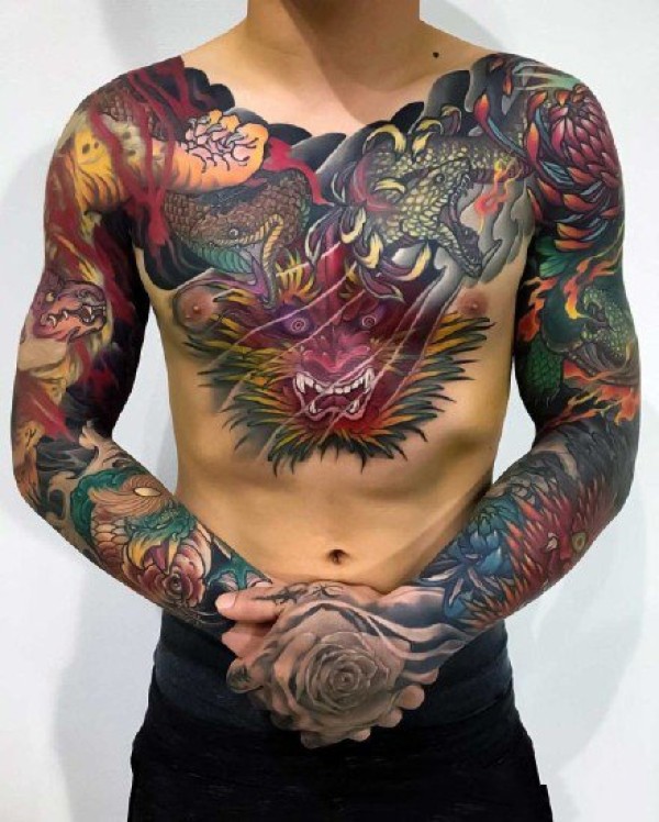 花胸纹身--一组男性霸气的大花胸纹身图案作品欣赏