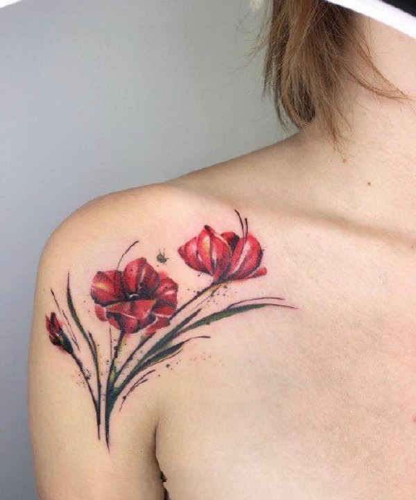 女生肩部锁骨的小清新水彩花朵纹身图案