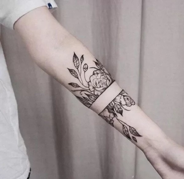 小臂上小清新的黑灰素花纹身图片