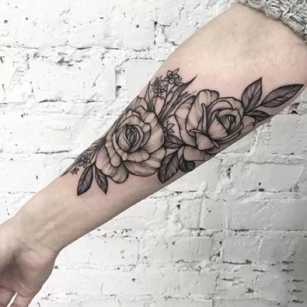 大臂素花纹身 9款女士的大臂黑灰花朵植物纹身图案