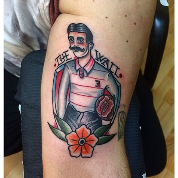 男生手臂上黑色几何线条卡通足球和人物纹身图片