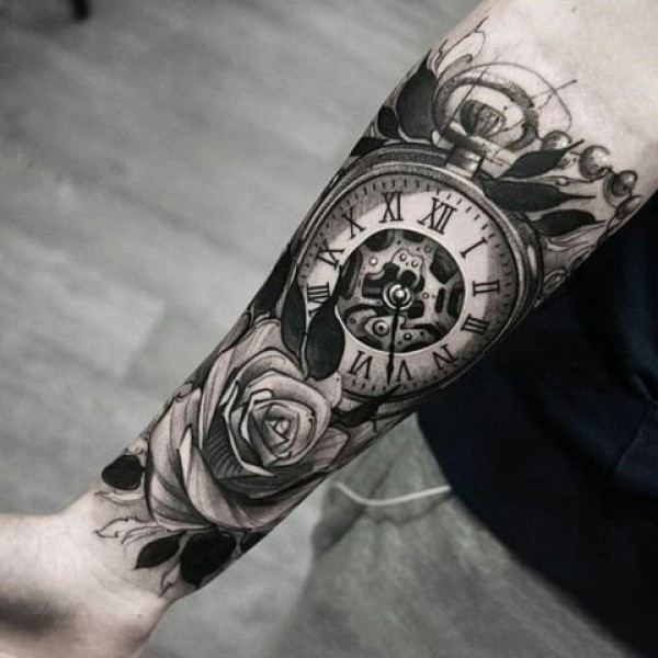 手臂胳膊上的欧美黑灰钟表玫瑰纹身图案9张