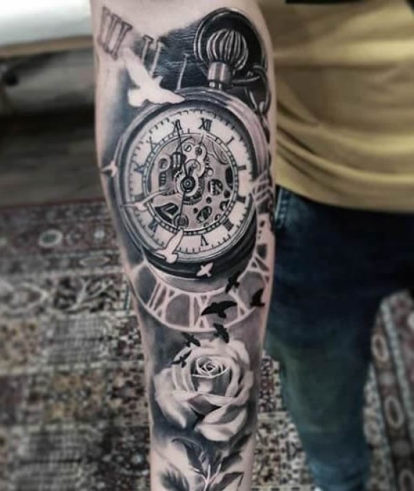手臂胳膊上的欧美黑灰钟表玫瑰纹身图案9张