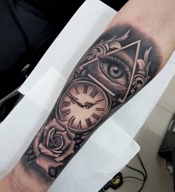 手臂胳膊上的欧美黑灰钟表玫瑰纹身图案9张