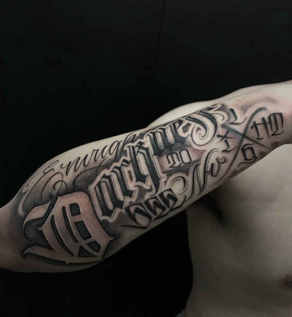 创意奇卡诺花体英文手臂纹身
