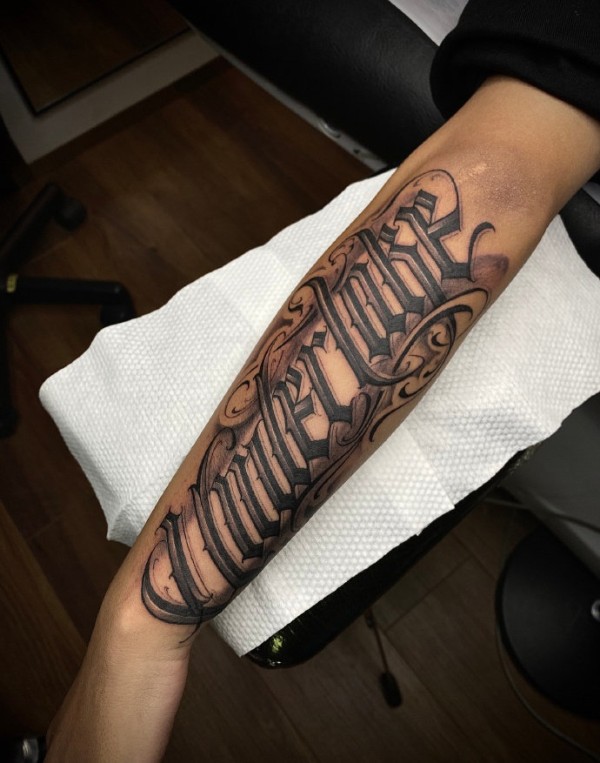 极度柔嫩的大臂内侧,花体英文加zZ字母