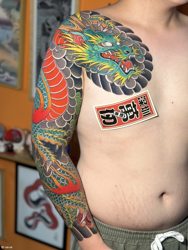 日式手彫刺青作品—半甲龙很感谢客户认可手彫刺青,手彫是日本纹身的手工雕刻技术,时间可以追溯到日本17世纪的江户时代。19世纪,手彫技术被日本黑帮挪用,被用作入会仪式,象征着从此就是江湖中人。在日式传统