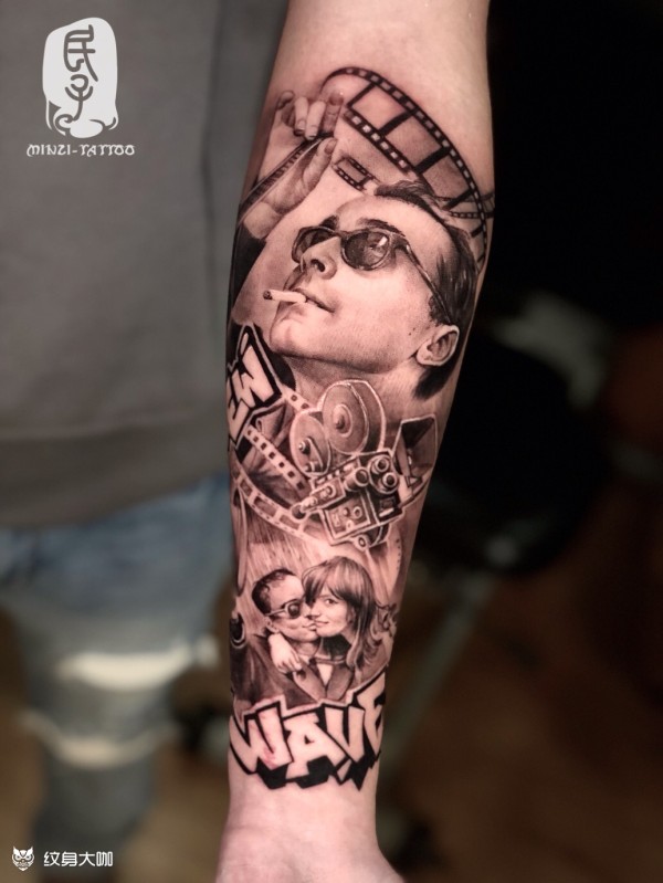 写实作品戈达尔,小臂内侧著名导演传奇人物,为客人量身设计构图致敬