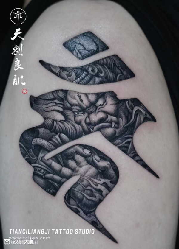 天刺十七年,良肌依旧/{taiyang}之前设计的是大臂外侧 不动明王,因为工作原因最后还是想做的小一些 所以用这种形式来做 轮廓是梵文字体也表示不动明王 字符里是不动明王 预示着字符中蕴含巨大能量