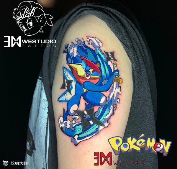 ▫️甲贺忍蛙定制▫️精灵宝可梦中的帅气忍者,原本图案是设计遮盖一只可爱的小蓝兔,在遮盖条件限制的构图下创作,但最终客人选择不做遮盖,将此图刺在了大臂上▫️设计制作by 阿樂
