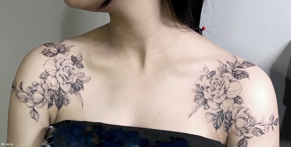 女生肩花纹身_15张女性双肩对称的肩花纹身图案作品图片