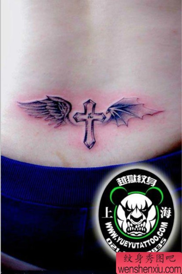 女生后腰唯美的天使与恶魔的翅膀纹身图案