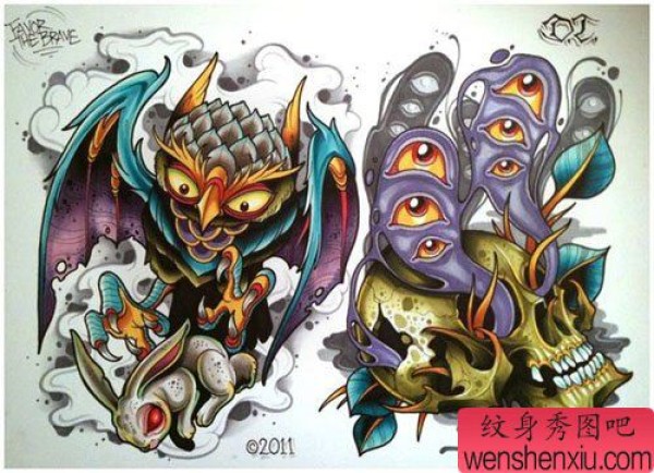 时尚很帅的猫头鹰与骷髅纹身手稿