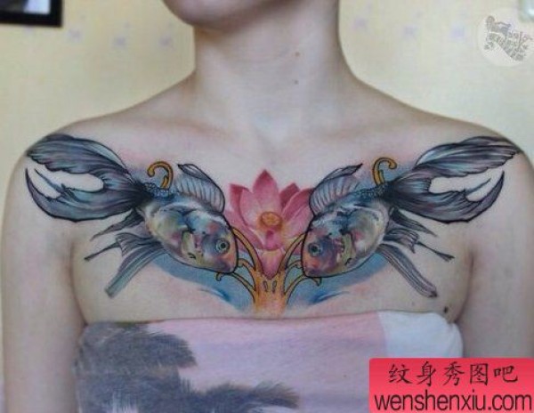 女性胸部彩色双鱼纹身图案