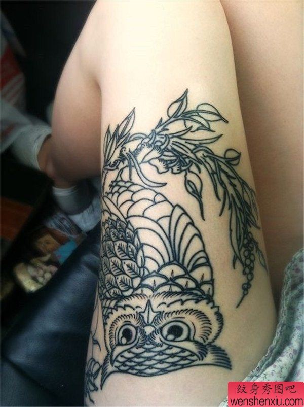 纹身图吧分享一张女性腿部猫头鹰纹身图案