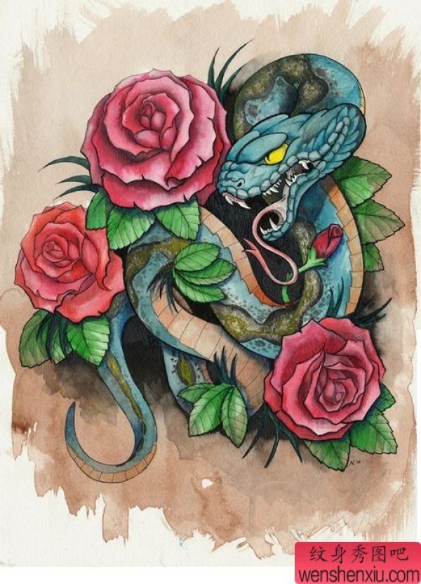 纹身图吧分享一张彩色蛇牡丹花文身手稿作品