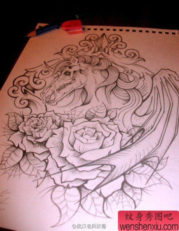 纹身图吧分享一张线条的马玫瑰花文身作品