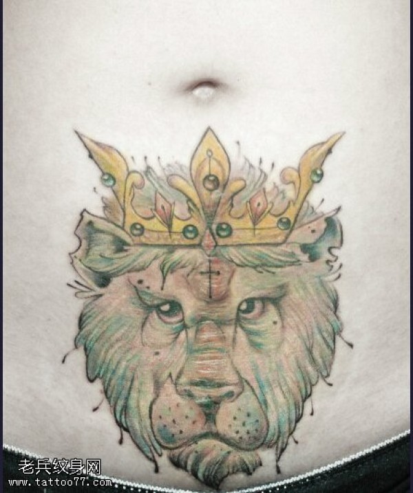 腹部彩色霸气的狮子皇冠文身作品由文身馆分享