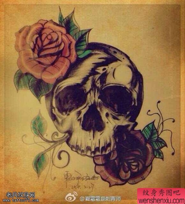 纹身图吧分享一张骷髅玫瑰花文身手稿作品