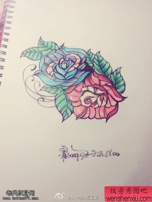 彩色玫瑰花文身手稿作品由纹身图吧分享