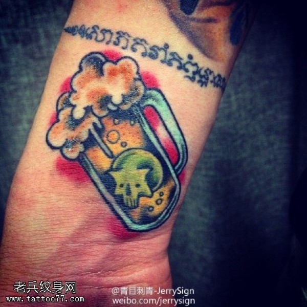 手腕小骷髅啤酒杯文身作品