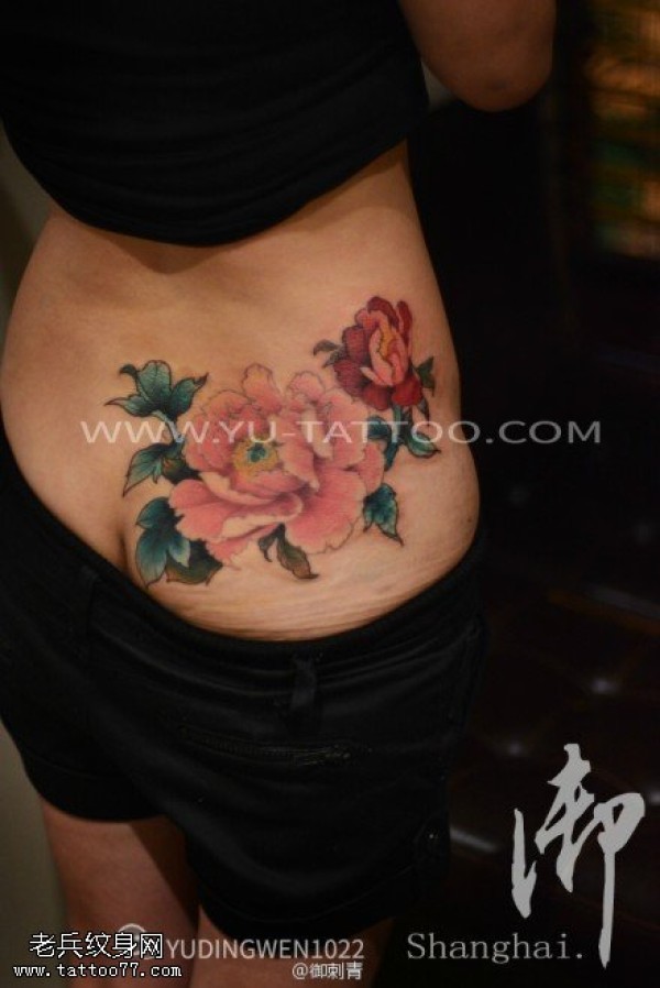 纹身图吧分享一张女性臀部彩色牡丹花文身作品