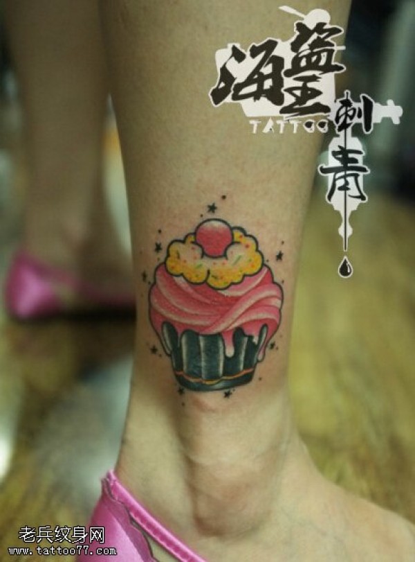 女性腿部彩色蛋糕文身作品由文身馆分享