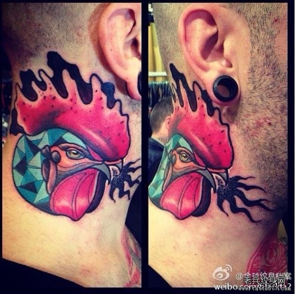 一款脖子彩色公鸡纹身图案