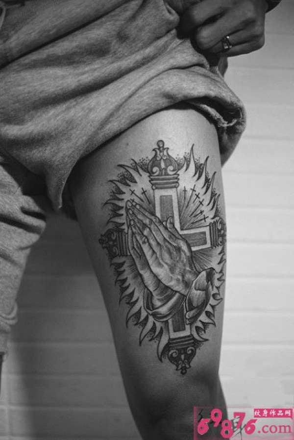 创意十字架双手祈祷黑白纹身
