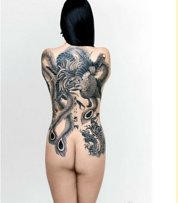 一款女生满背黑白凤凰纹身图案