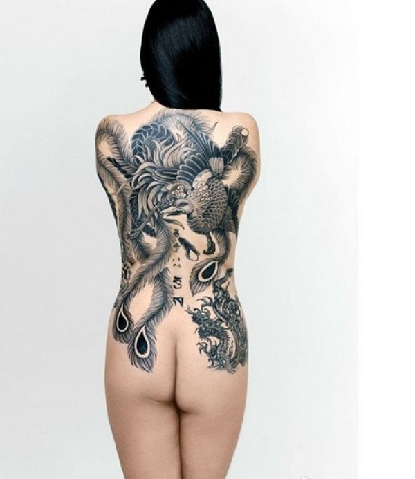 一款女生满背黑白凤凰纹身图案