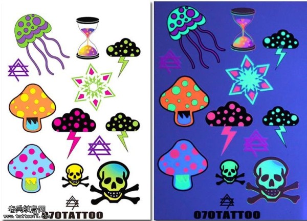 彩色蘑菇沙漏闪电云骷髅纹身手稿图案